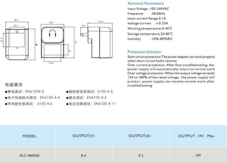 頻率:50/60Hz 輸入電流:0.1A 漏電電流:≤0.25A 工作溫度:0-40℃ 貯藏溫度:-20-80℃ 濕度:10%-80%RH 短路保護(hù): 電源適配器在短路解除時(shí)能正常工作恢復(fù) 過流保護(hù):過流故障排除后,電源將自動恢復(fù)正常工作 過壓保護(hù):當(dāng)輸出電壓超過額定電壓的150-180%時(shí),電源將保護(hù),故障排除后電源能恢復(fù)正常工作" />