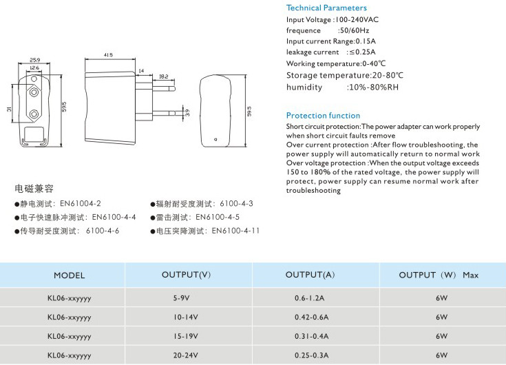 短路保護: 電源適配器在短路解除時能正常工作恢復